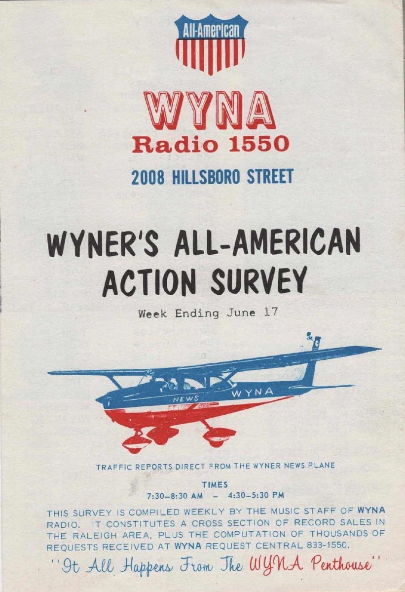 WYNA had a short life as a Top 40 station from May 1966 until November 1967. It was known as “All American 1550” with DJs Bobby Dark, Phil Geiger, Tom Scott and a young Dale Vann (Horn). “WINNER” has all the bells and whistles of 1960s Top 40 radio: energetic DJs, chime time, reverb and a hot jingle package: Pepper’s “It’s What’s Happening”. WYNA had a weekly printed “Action Sound Survey” available at local record stores. The station also featured airborne traffic reports.