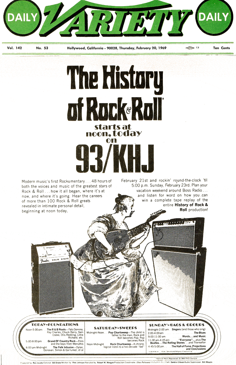 The Original History Of Rock And Roll was produced and directed by 93/KHJ Program Director Ron Jacobs, a genius of unmatched quality, and written by Pete Johnson, pop music reviewer for the Los Angeles Times. Renowned 93/KHJ on-air personality Robert W. Morgan narrated the complete show without laying down one single voice track in advance. As a veteran staff member, I (Bill Mouzis) provided elaborate production and audio engineering. Never before had musical montages been used so effectively, with interviews and actualities interspersed throughout the complete show. Sandra Gibson and Ellen Pelllissero were expert in assessing content and in providing project coordination.